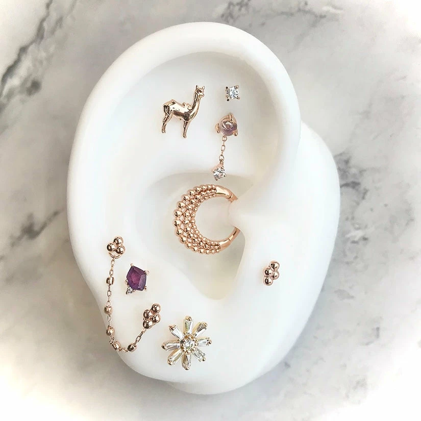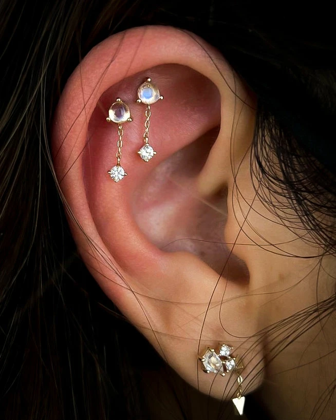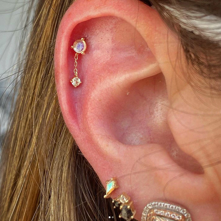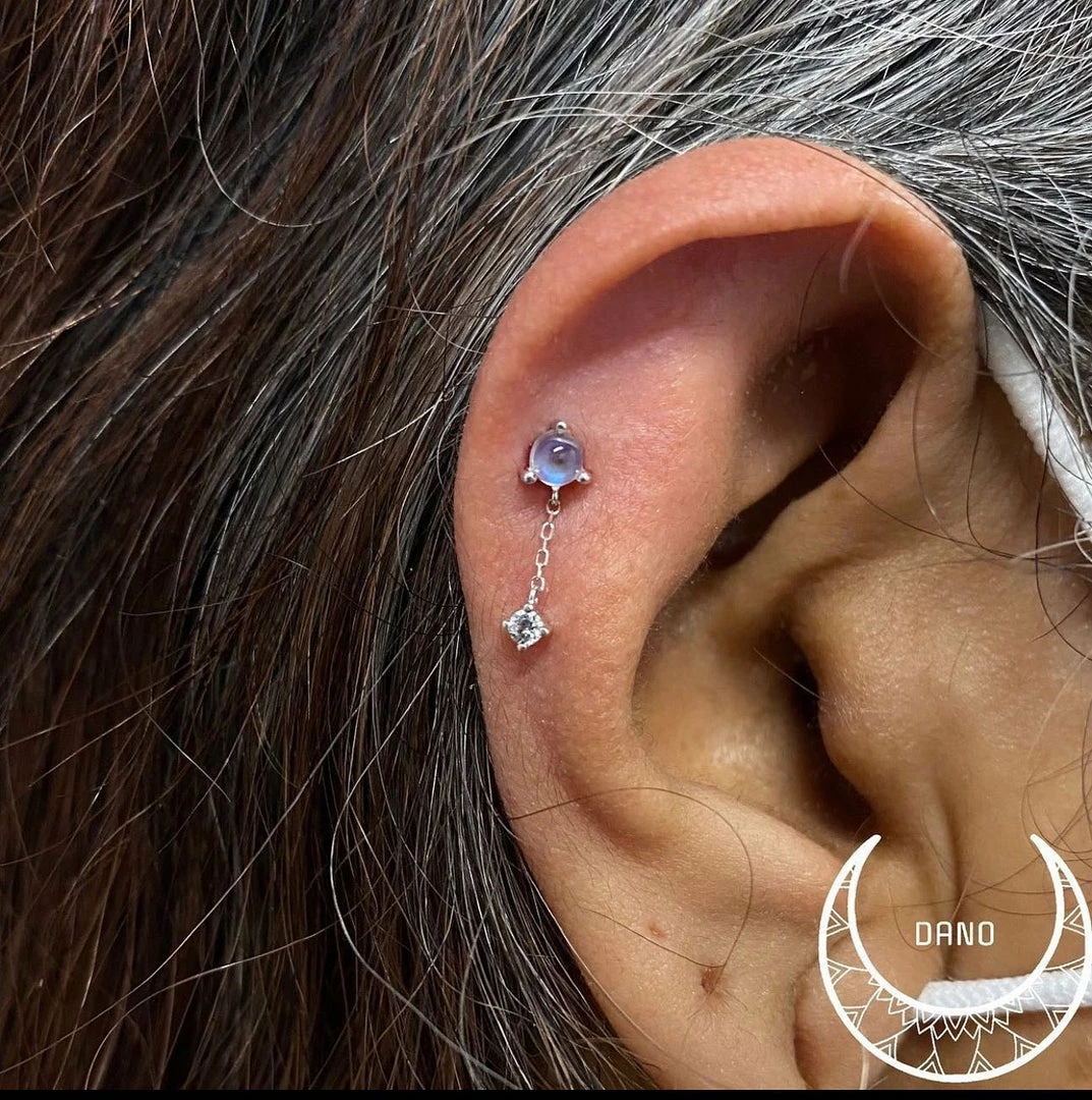 The soft glow of the Moonstone is beautifully complemented by the sparkle of the White Sapphire making this the perfect design for anyone who loves a little extra shine and movement to their piercing!