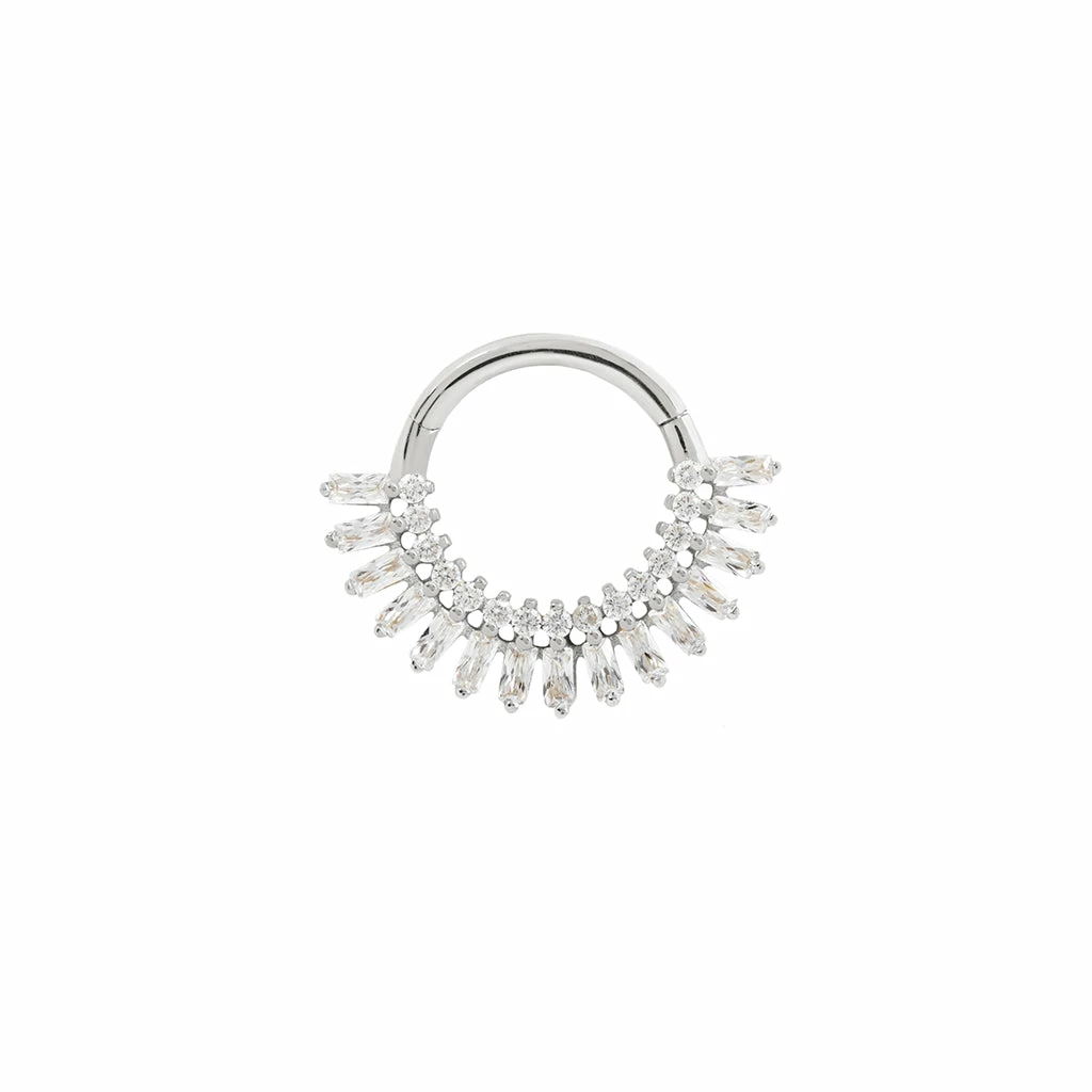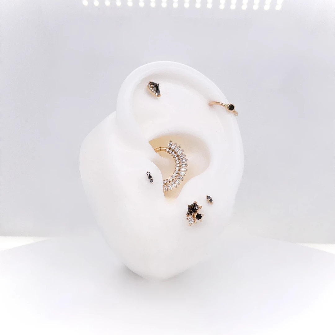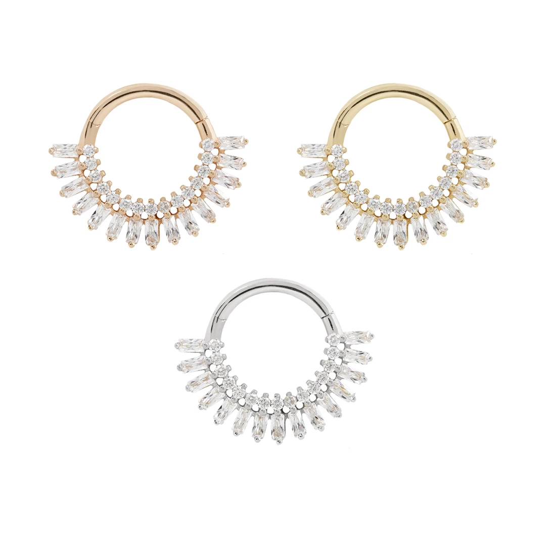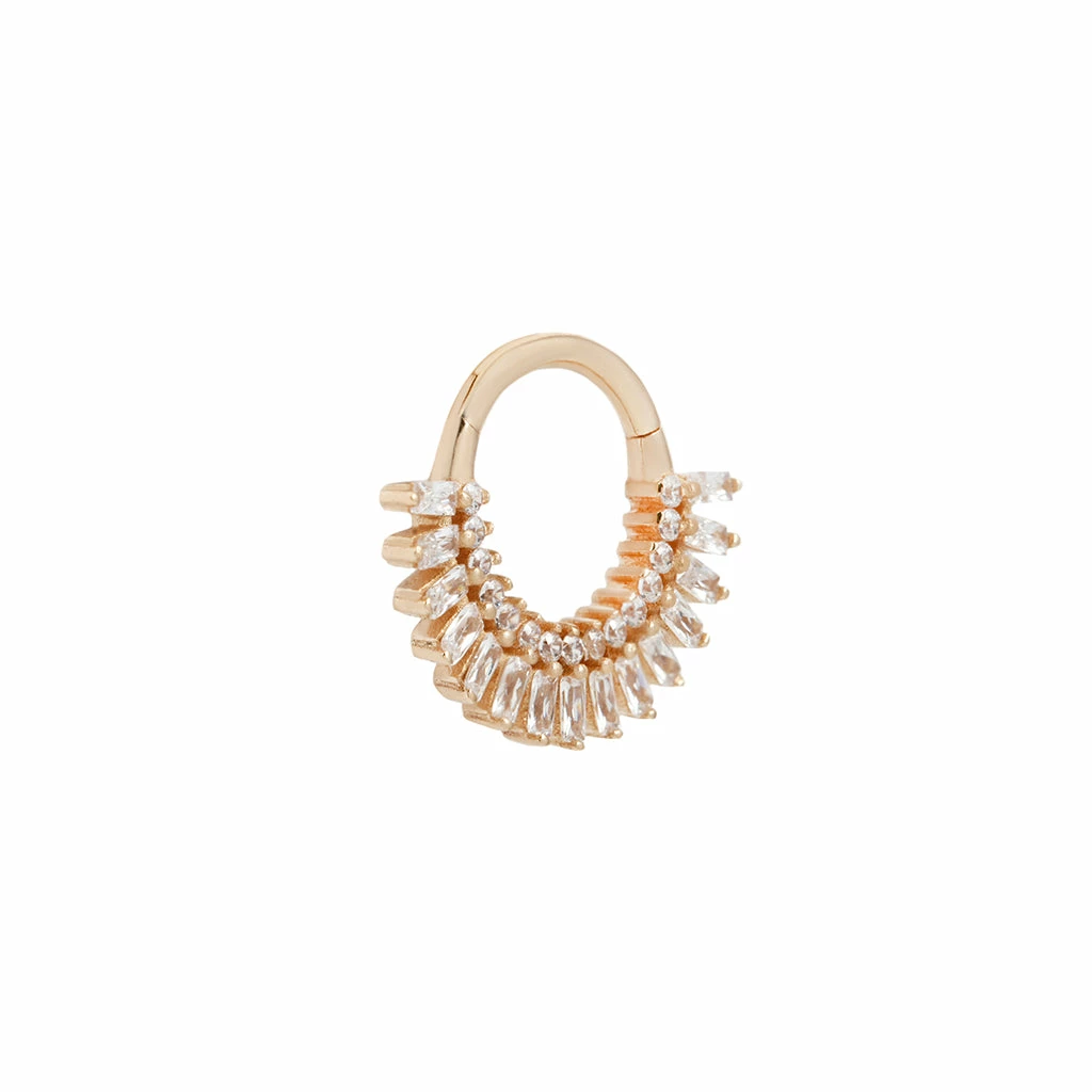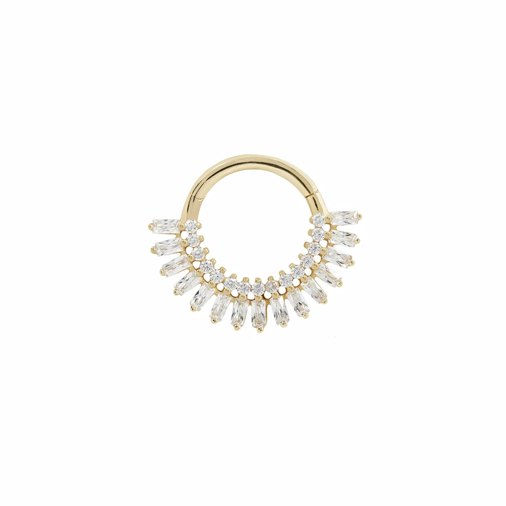 Sparkle brighter than ever in our Hypnotic Clicker! Adorned with 30 CZ’s in Solid 14kt Gold, this piece is sure to help you stop the show wherever you go. The hinged clasp allows you to easily open and close it’s perfect to wear in your septum, earlobe, daith piercing, and much more!Â