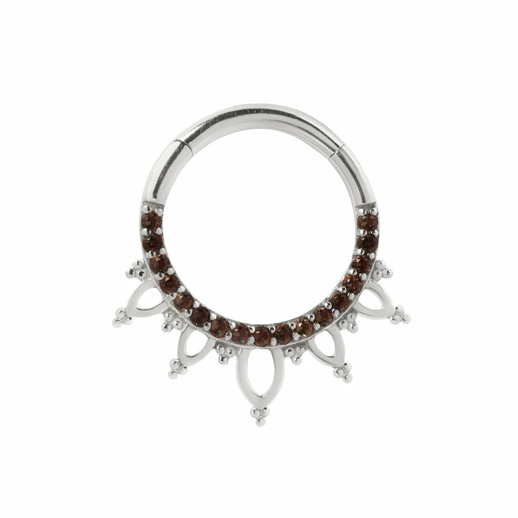 This popular design features a fiery change from the original with fifteen round cut genuine smokey quartz gemstones.