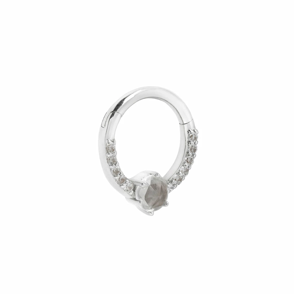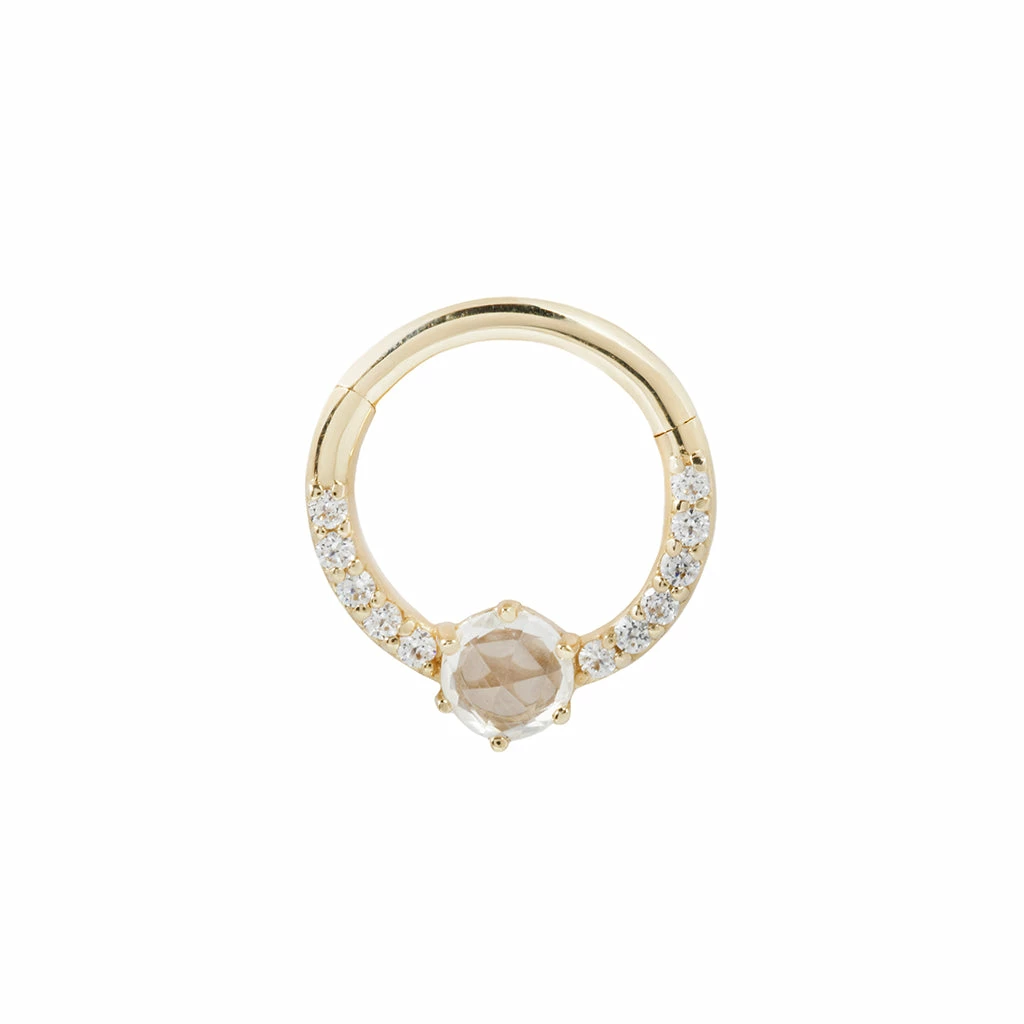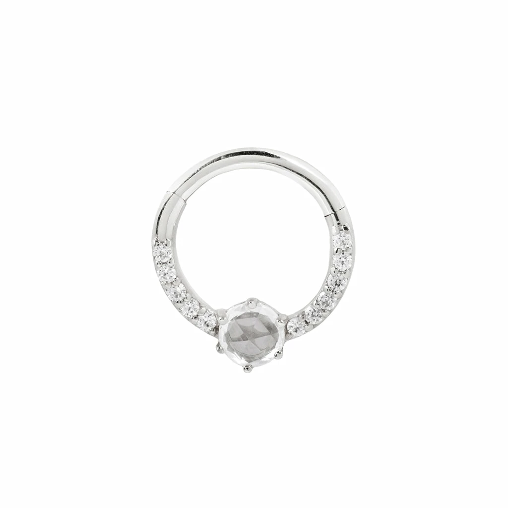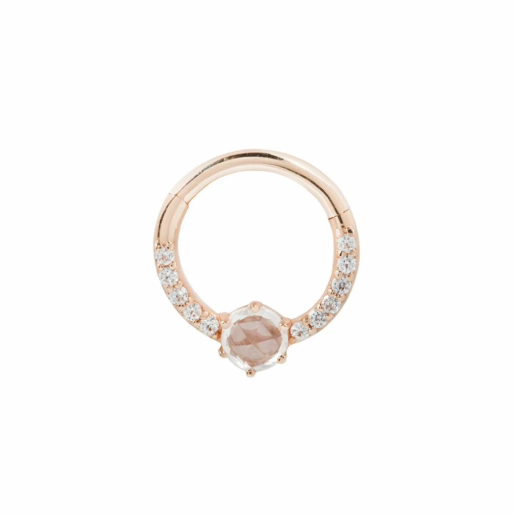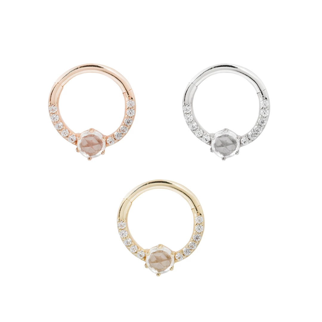 This elegant solid gold clicker design is adorned in the middle with a Rose Cut Sapphire, surrounded by 11 Swarovski CZ’s. All eyes will be on you! A fabulous piece for a septum or daith piercing!