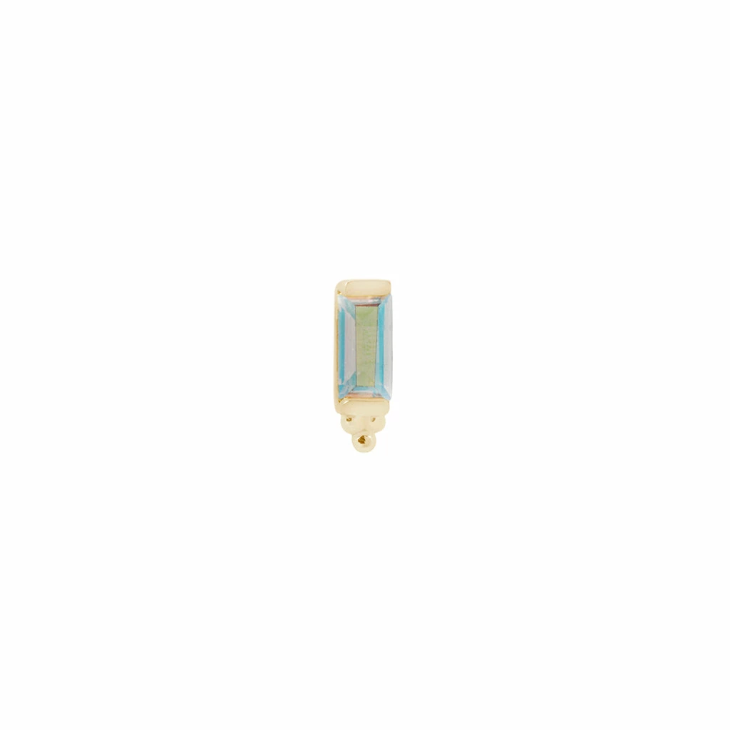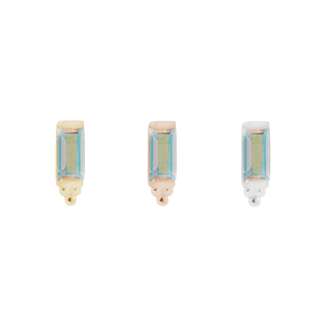 This chic design features an iridescent baguette-cut Mercury Mist, adorned with hand made beading detail at the base. ย A charming piece that will stand the test of time!ย