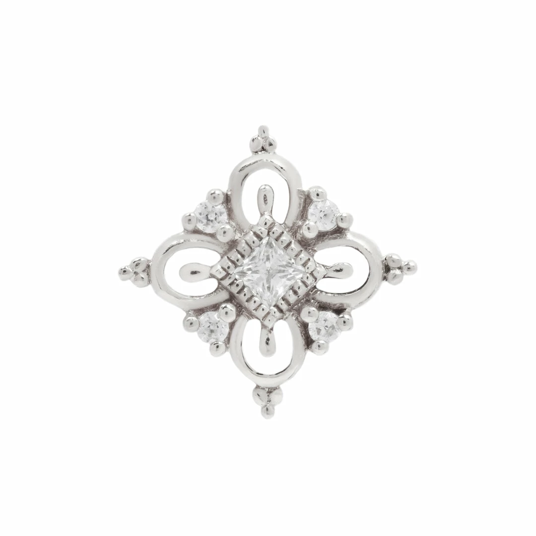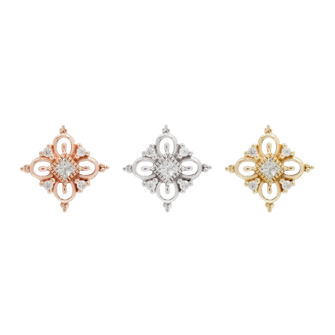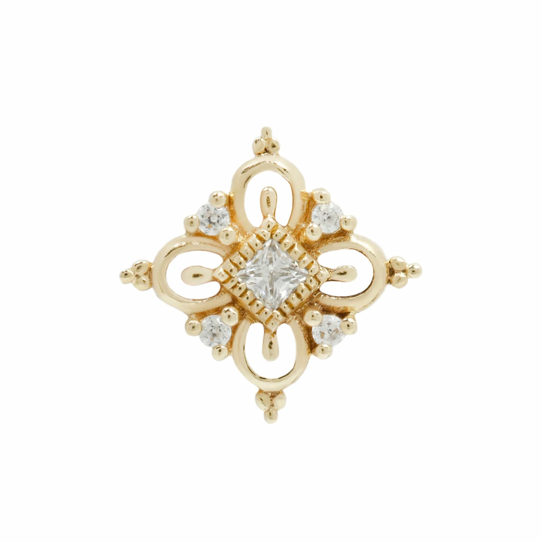 The Esmee solid gold threadless end has delicate petal cut-outs to curate a timeless, vintage-inspired style.ย This design showcases five sparkly CZ’s to enhance your elegant look!ย