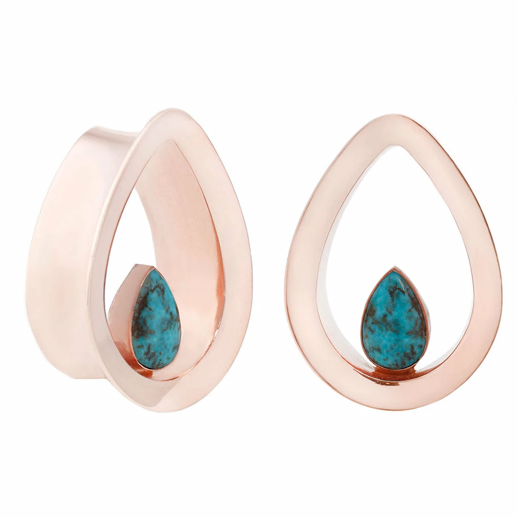 Mayan double flared teardrop plugs, adorned with a genuine turquoise inlay. Each stone has been handpicked by our designers!Â