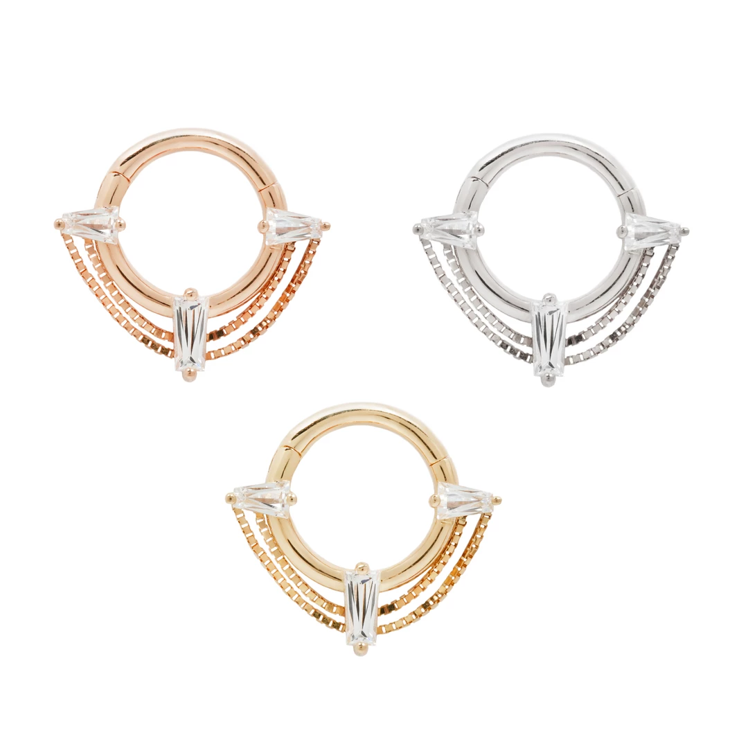 The Fetish clicker made of solid 14kt goldย has two handmade box chains accented by three Swarovski baguette CZ’s.