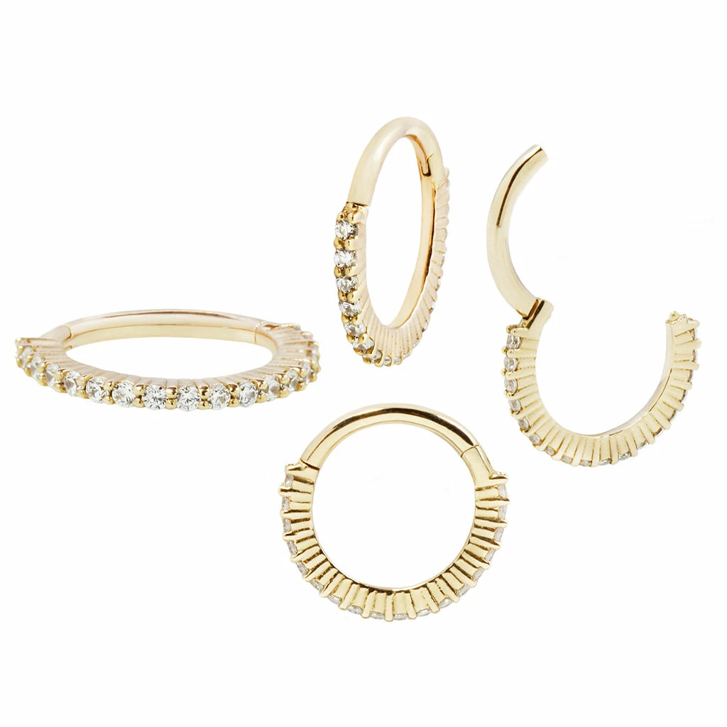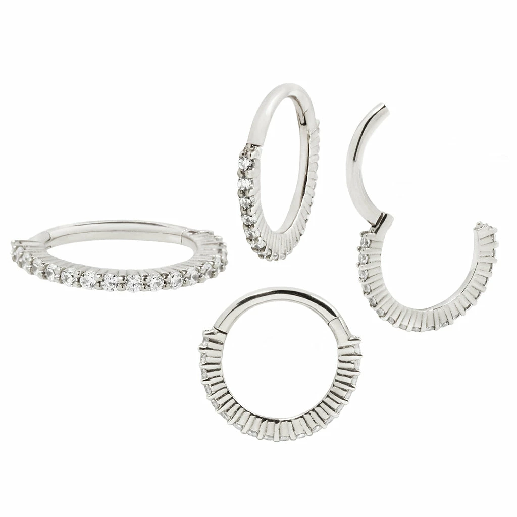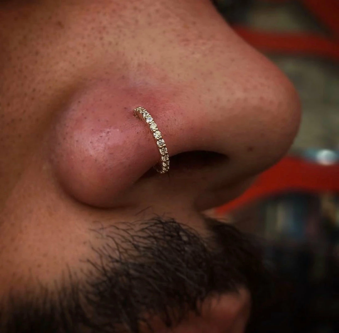 The Radiant clicker features forward-facing handset CZ’s and hand-etched art deco designs. This design is made to sit perfectly in your nostril or ear piercings!